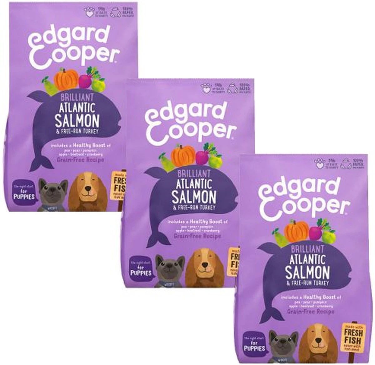 Edgard & Cooper Puppy Verse Zalm / Kalkoen Graanvrij Hondenvoer Dit heerlijke, graanvrije recept met verse zalm en kalkoen is speciaal ontwikkeld voor groeiende puppyβs. Zelfs de meest kieskeurige pups zijn fan! De brokjes zijn rijk aan makkelijk te verteren, hoogwaardige eiwitten β dus geen gedroogd of gedehydrateerd vlees β waaronder zalm, een natuurlijke bron van omega 3. Aan deze brok is een supergezonde mix van fruit en groenten toegevoegd, en lekkere kruiden en botanicals voor een extra boost. Die fantastische blend wordt langzaam gebakken: zo blijft al dat goede perfect bewaard. Voordelen van Edgard & Cooper Puppy Verse Zalm / Kalkoen Graanvrij Hondenvoer β Graanvrij β Veel vers vlees β Sterke botten en gewrichten (glucosamine en chondroΓ―tine) Voedingsadvies Het voedingsadvies is gebaseerd op een normale energiebehoefte van jouw hond. De lichaamsconditie van jouw hond is de leidraad voor de actuele voergift. Indien
