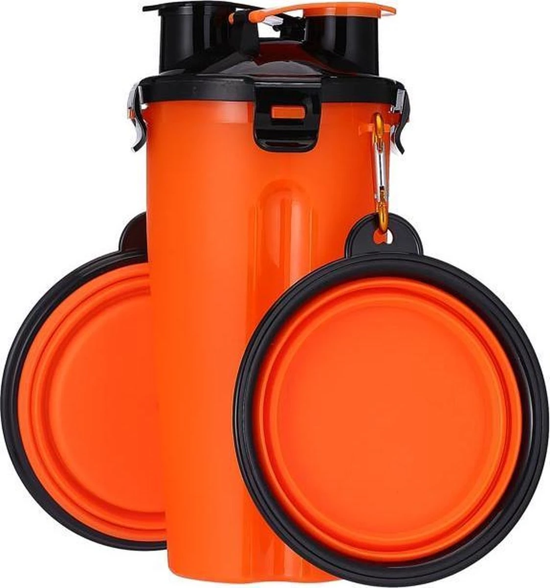 2 in 1 voer en drinkfles voor huisdieren incl. opvouwbare siliconen bakken (2 x 350ml) + 2x karabijnhaak.