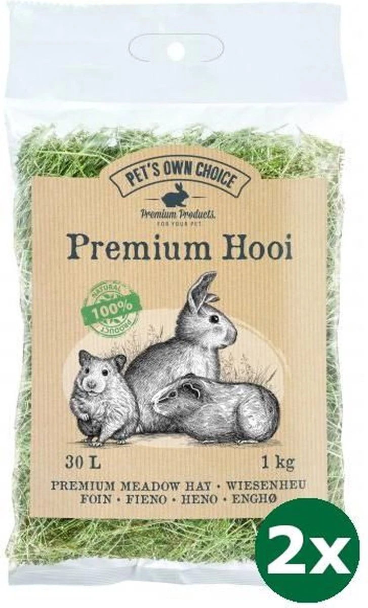 Pet’s Own Choice Premium Berghooi 4 x 1 kgPet’s Own Choice Premium Berghooi van 4 x 1 kg is belangrijk ruwvoeder voor jouw konijn, cavia of ander knaagdier.Hooi is essentieel voer voor konijnen en knaagdieren. Door de ruwe vezels heeft hooi een positief effect op het gebit en de darmwerking van jouw dier. Door de ruwe vezels moeten blijven de darmen van jouw konijn constant in beweging, wat essentieel is voor een gezond konijn. Daarnaast moet het konijn langdurig kauwen op het hooi, wat helpt de kiezen op de juiste manier af te slijten. De kiezen van een konijn groeien gedurende zijn hele leven door en daarom is het belangrijk dat jouw konijn veel goed hooi tot zijn beschikking heeft. Ook gaat hooi verveling tegen; dieren zijn lang bezig om het op te eten, en daarnaast nestelen bijvoorbeeld cavia’s, muizen en hamsters er graag in. Met dit premium hooi