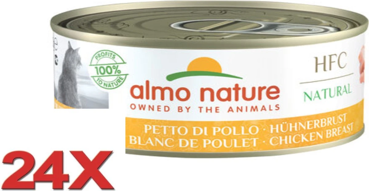 Almo Nature heeft voor de volwassen kat de ‘Almo Nature HFC 150 Natural met Kippenvlees’. Deze smaakvolle en klassieke maaltijd in blik bestaat uit maar liefst 75% vlees en is enkel bereid met natuurlijke ingrediënten. De kip is afkomstig uit de vrije houding, dat wil zeggen dat deze vrij zijn van hormonen en antibiotica tijdens het fokken.