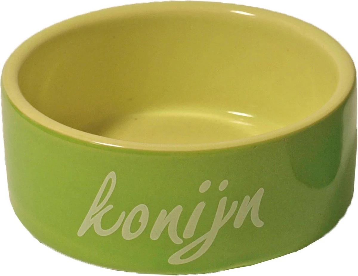 Groene voerbak voor konijnen, met print βkonijnβ. Gemaakt van steen.