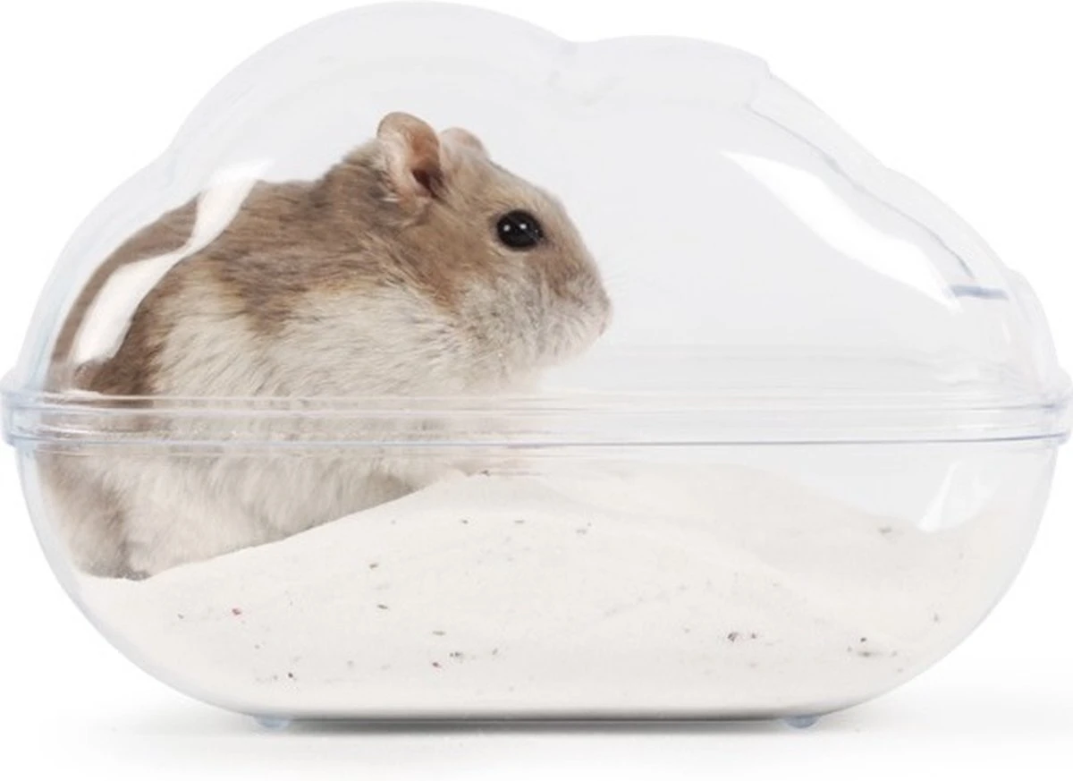 Een kunststof transparant hamster zandbakje met deksel.