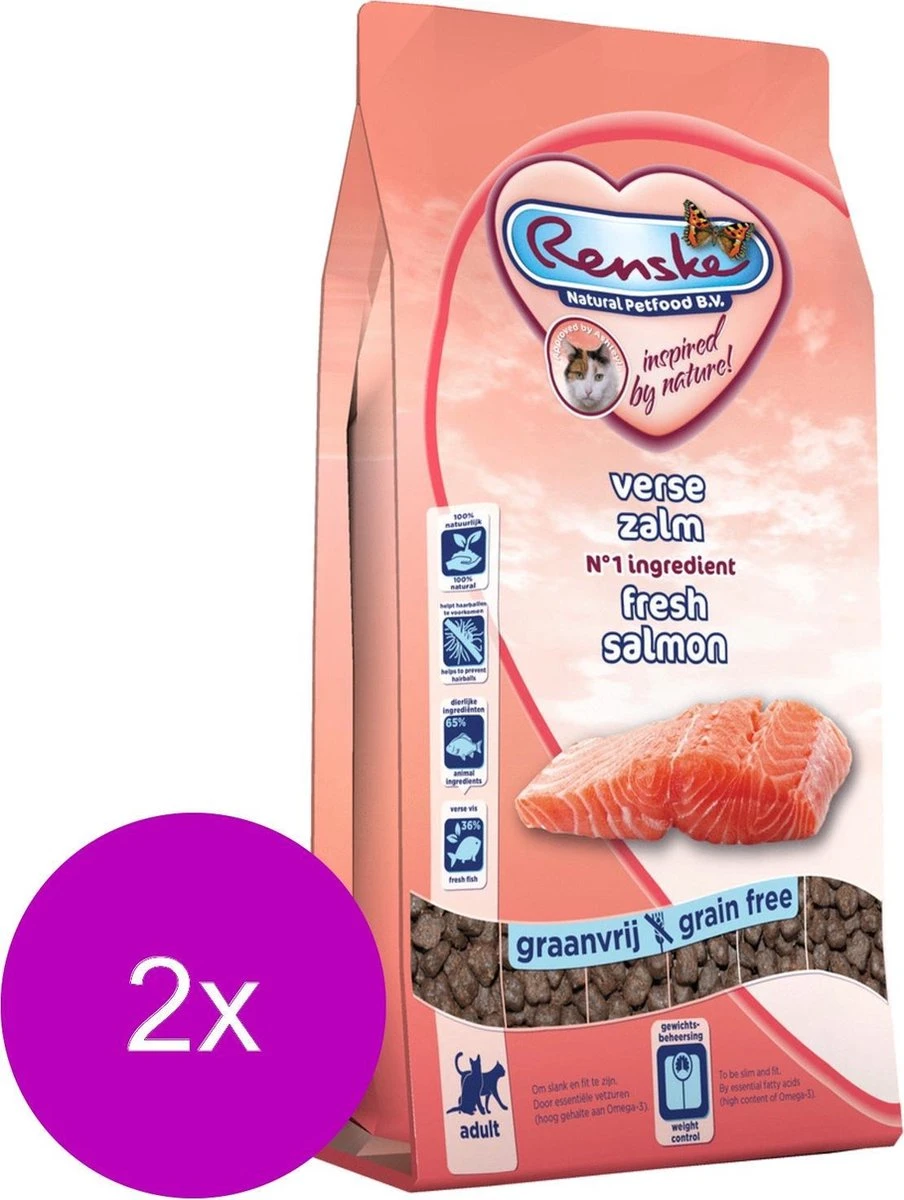 Renske Super Premium Adult Verse Zalm 1,5 kg Een complete, lichtverteerbare graanvrije voeding met verse zalm. Geschikt voor katten van alle rassen.ulliVerse zalm als hoofdingrediënt (36%, totaal dierlijke ingrediënten 65%). /liliVoor regelmatige, stevige ontlasting. /liliOndersteunt de schildklier, door het lage gehalte iodine.