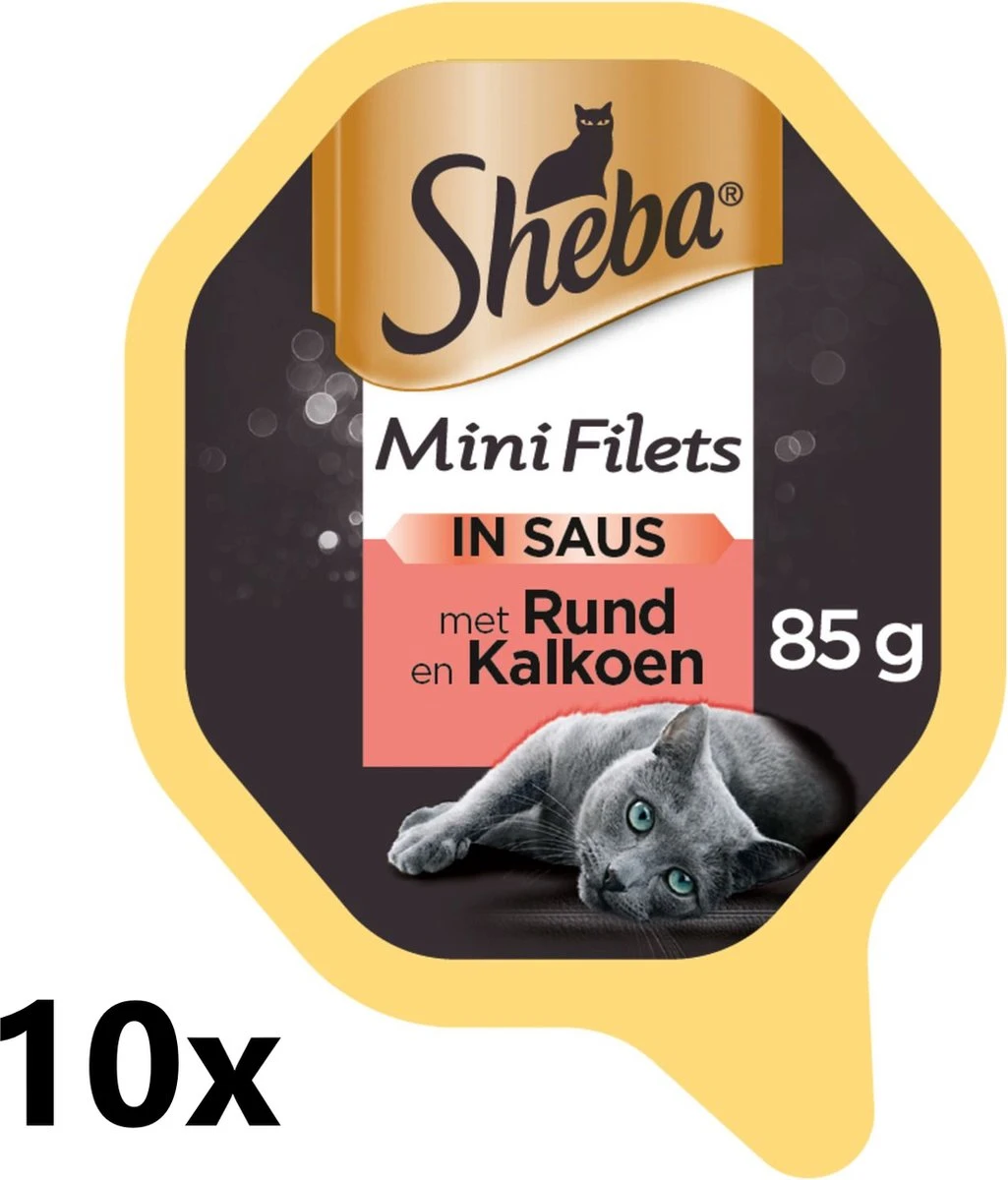 Sheba Mini Filets in Saus bevat 85 g en is verkrijgbaar in de smaken kip-kalkoen, kip-lam, rund-kalkoen en wild-konijn.